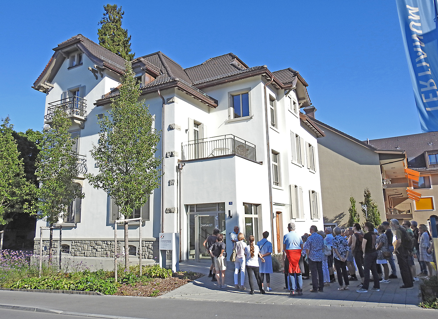 Zahlreich erschien die Zuhörerschaft – auch Auswärtige – vor dem «ersten Haus im Dorf», der ehemaligen Seidenzwirnerei von Rudolf Zinggeler-Syfrig (1819–1897). Zinggeler errichtete an der Seestrasse 1 eine imposante Fabrik, die bedauerlicherweise im Juni 2010 den Flammen zum Opfer fiel. Dem innovativen Industriellen hat Richterswil unter anderem das Hydrantensystem zu verdanken, welches aus dem angelegten Sternenweiher gespiesen wurde. Zur Eröffnung der Nordostbahn 1875 schoss auch zum ersten Mal die Fontäne in der Garnhänki in die Höhe, die noch heute betrieben und bewundert wird.