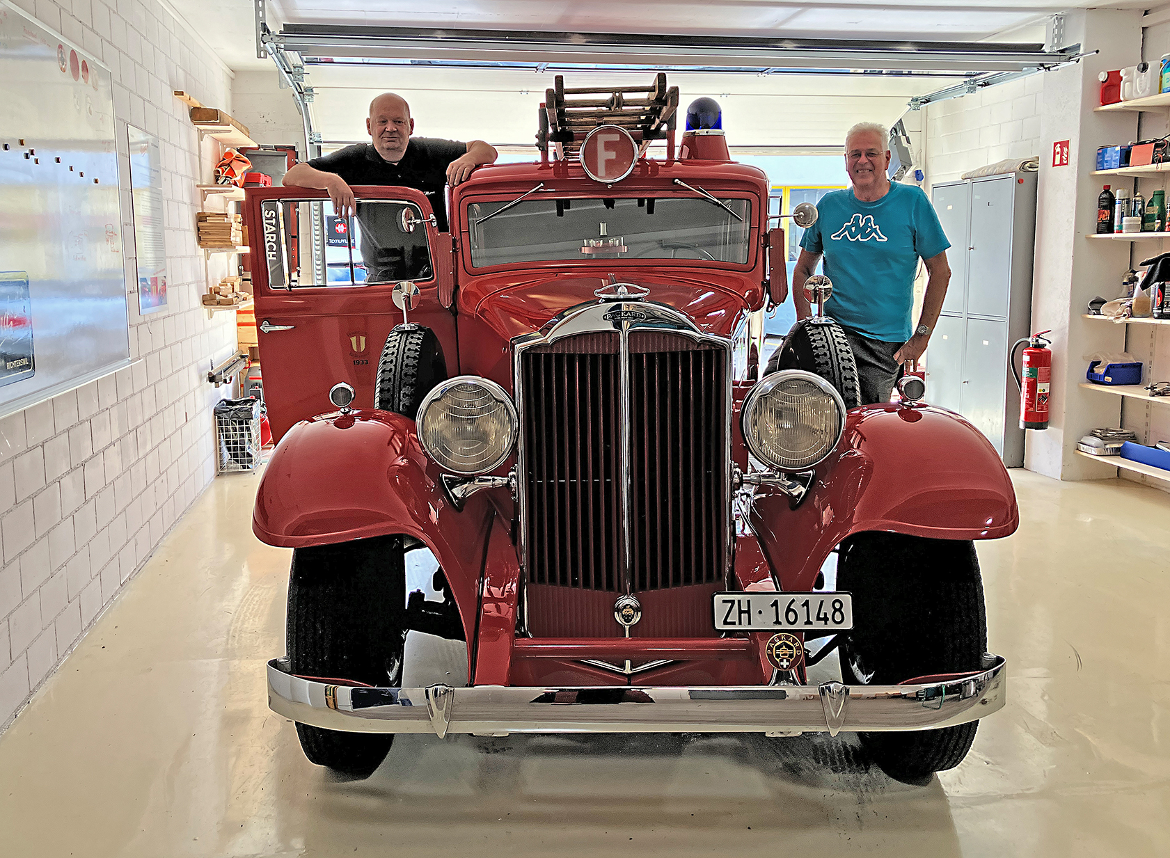 Auf 70 Quadratmetern wurde eine gut ausgerüstete Werkstatt samt Schränken für die «Gwändli» und eine Sitzecke eingerichtet – alles vom Verein selbst finanziert und eingerichtet. Da lässt es sich auch bequem Pause machen, wenn jemand am Fahrzeug zugange ist oder eine Vereinssitzung abhalten. «Wir sind sehr zufrieden hier», sagt Glükler, denn nun sei genügend Platz vorhanden, um auch an dem Oldtimer zu arbeiten. Sogar die erste Motorspritze der Gemeinde steht dort, über ihr an der Wand Bilder der alten Feuerwehrgarde und Erinnerungsfotos, die in Zusammenhang mit dem rotglänzenden Packard stehen.