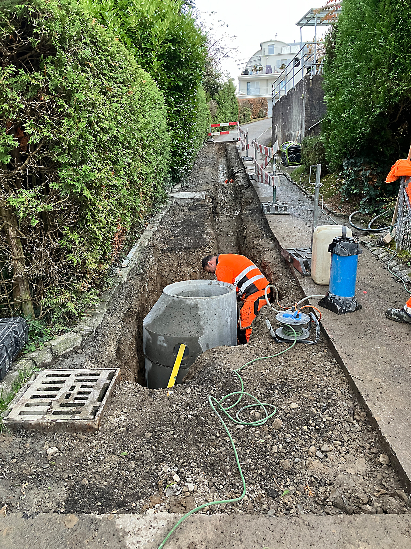 Nun wurde ein Versuch unternommen, dem Wasserfluss entgegenzuwirken. Auf einer Strecke von etwa 25 Metern wurde in einem Graben mit Kies eine neue Sickerleitung verlegt, um das Hangwasser wieder abtransportieren zu können. Zusätzlich installierten die Arbeiter einen Sickerschacht, der das Wasser auffangen und besser verteilen kann. Dieser Sickerschacht ist von oben zugänglich und kann somit unterhalten werden. So sollten keine Ausschwemmungen stattfinden.