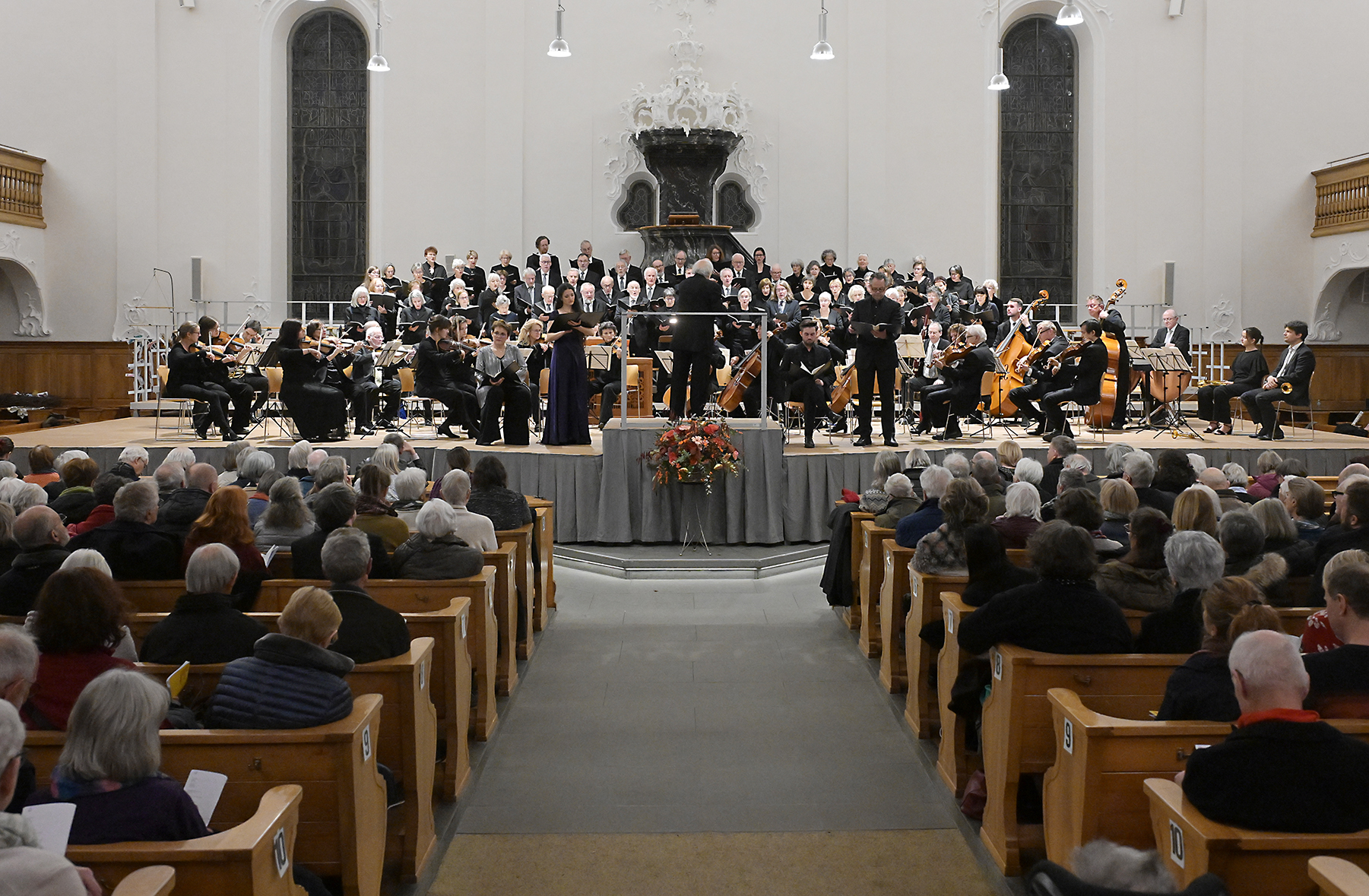 Den Schlusssatz der Bach-Kantate beginnt erneut Tenor Postuma, begleitet vom Cello, bevor das gesamte Orchester und der Oratorienchor einsetzen und das Kirchenschiff der reformierten Kirche Wädenswil gänzlich in eine wohlige Klanghülle verwandelt.
