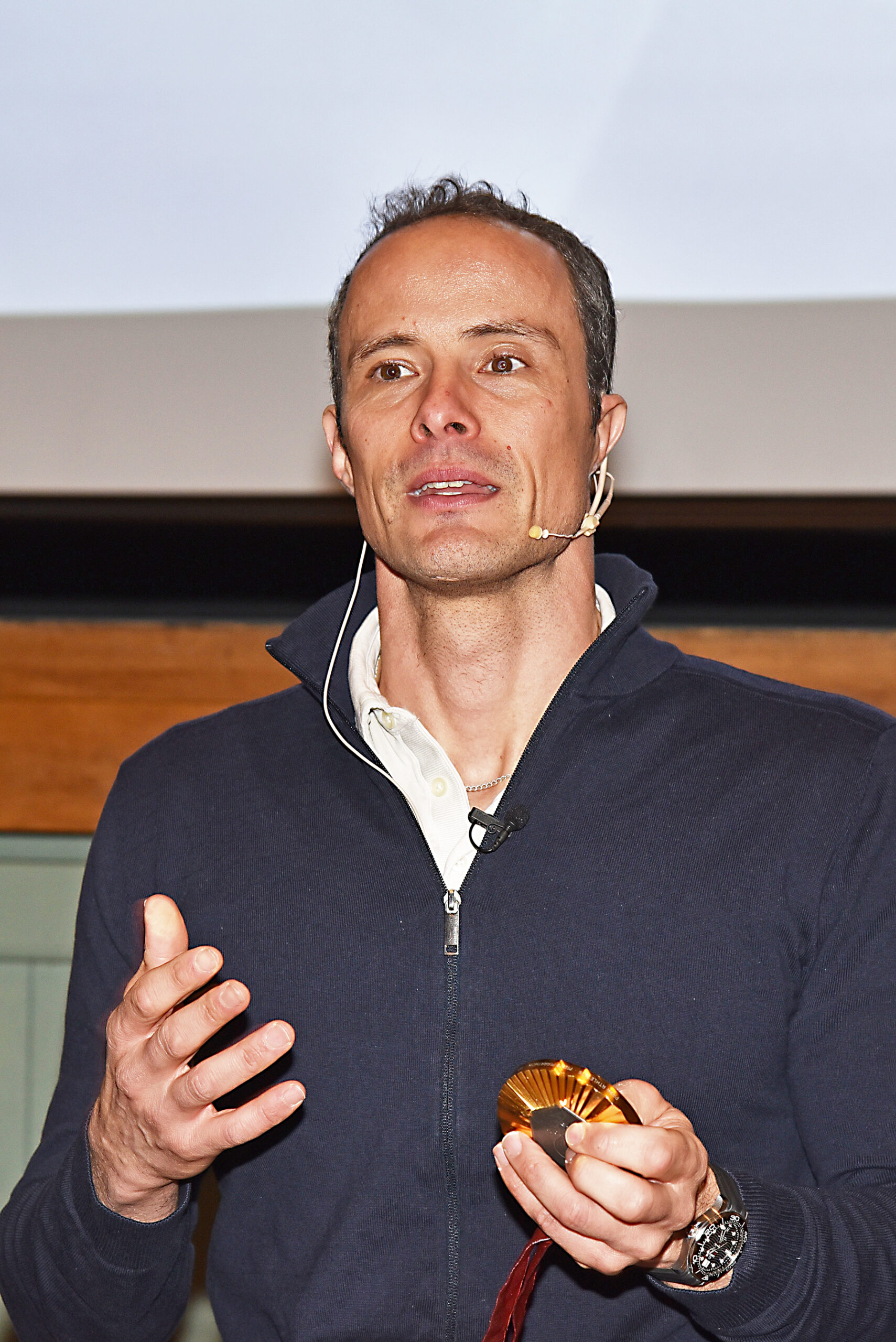 Sein Einstieg blieb in Erinnerung: Er zog seinen Turnschuh aus und holte schmunzelnd eine grosse, schwere Goldmedaille hervor: «Ich stehe buchstäblich auf meiner Medaille.»