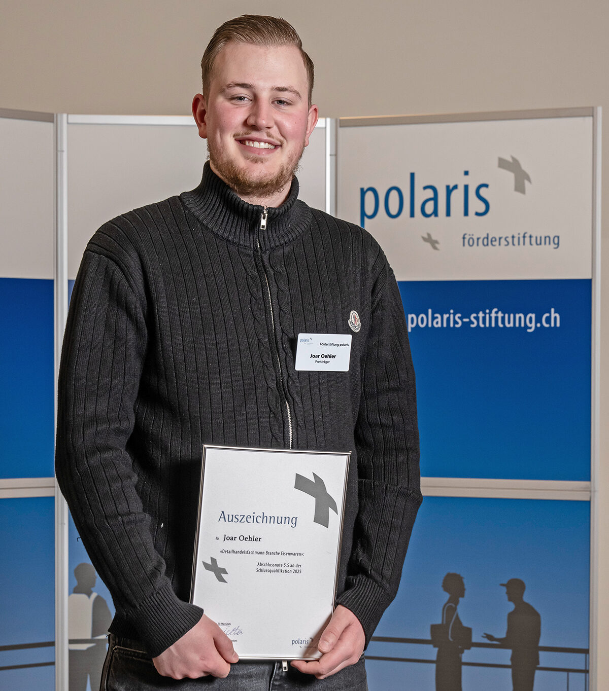 Der polaris Förderpreis ging in diesem Jahr an vier Lehrabgängerinnen und Lehrabgänger aus dem Bereich Eisenwaren, an eine aus dem Sektor Haushalt und an zwei Berufsleute aus dem Bereich Farben. Weiter wurden die Haushaltsabteilung eines Berner Kaufhauses, ein Handwerkercenter in Basel und ein Farbengeschäft in Unterentfelden AG geehrt. Joar Noa Oehler aus Wädenswil ZH hat seine dreijährige Berufslehre als Detailhandelsfachmann EFZ Eisenwaren bei der Würth AG in Pfäffikon SZ gemacht. Mit einer Abschluss-Gesamtnote von 5,5 gehört er zu den Gewinnern.