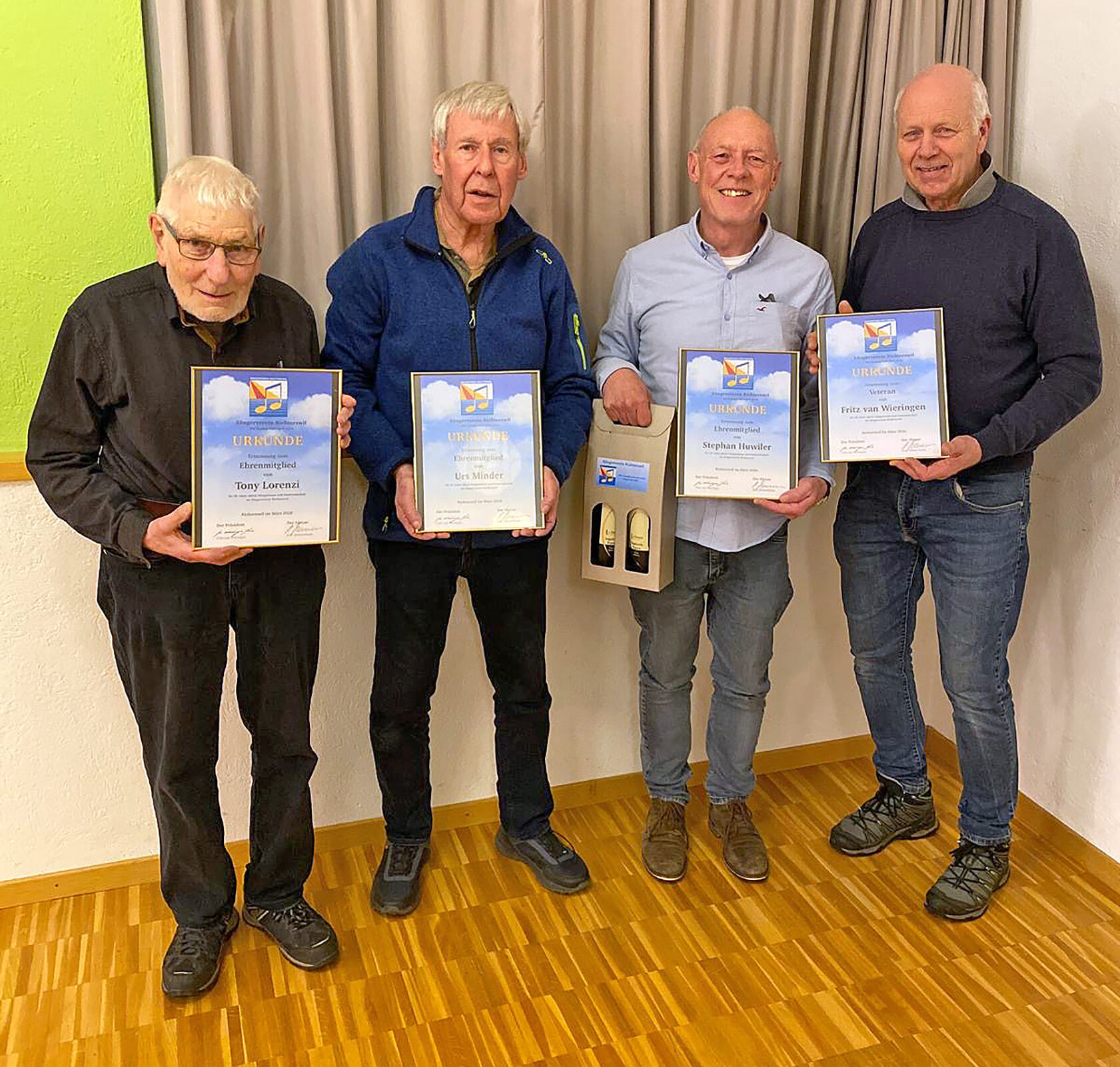 Die Jubilare Stephan Huwiler, Toni Lorenzi und Urs Minder werden für 30 Jahre Treue zum Sängerverein Richterswil mit einer Urkunde zu Ehrenmitgliedern ernannt. Fritz Van Wieringen erhält für 20 Jahre Mitgliedschaft als neuer Veteran das goldene SVR-Abzeichen.